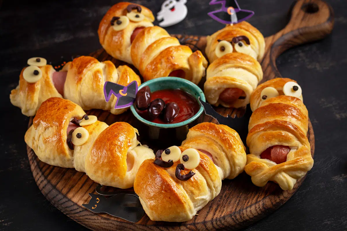 Wrap crescent roll dough around hot dogs, bake until golden, and dot on mustard or ketchup eyes. These mummy dogs are a Halloween classic that always disappears fast!