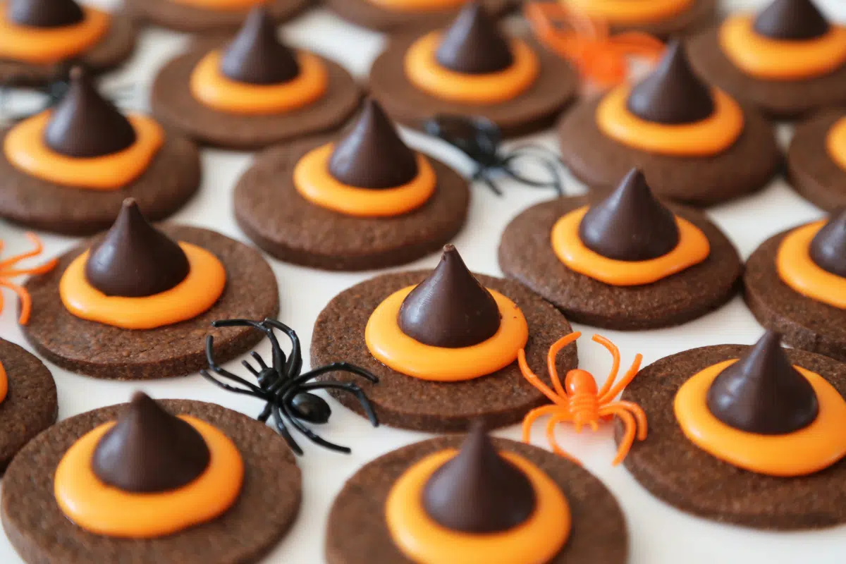 Turn chocolate cookies into witch hats using a chocolate kiss and a ring of orange frosting. They’re simple, festive, and irresistibly cute.