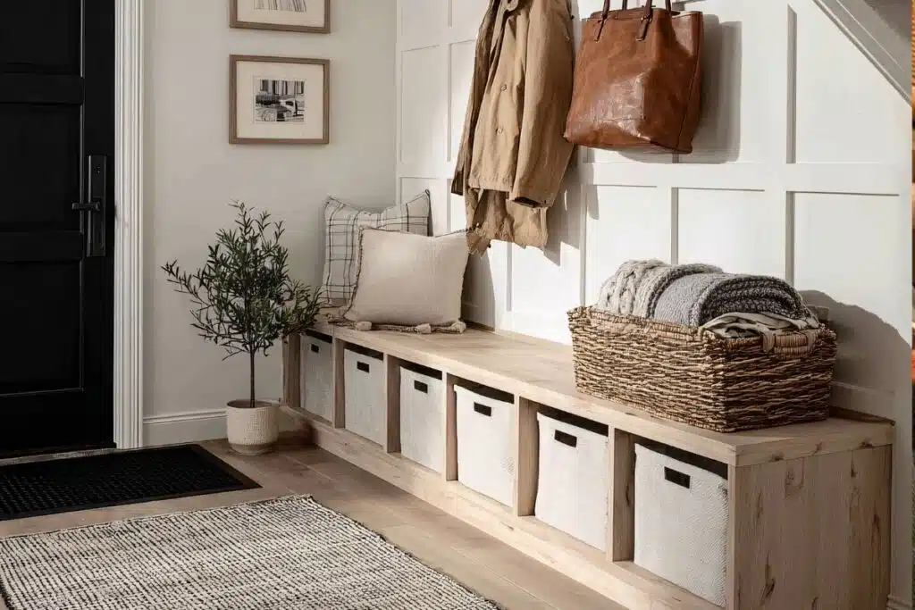 Hooks, baskets, and a small bench near the entry keep bags, shoes, and keys from spreading throughout the house. Everything lands in one place, right when you walk in.