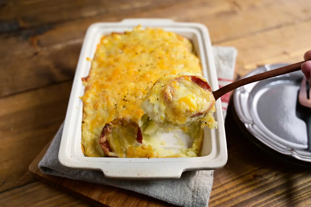 All the flavors of a loaded baked potato—crispy bacon, melted cheddar, and sour cream—baked into one irresistible dish.