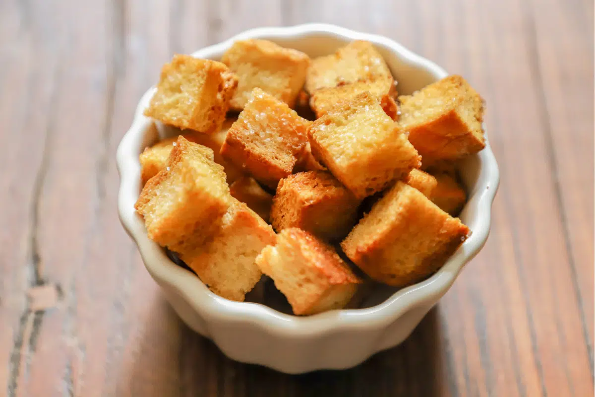 Cube your leftover bread, toss with olive oil, garlic, and herbs, then bake until golden and crispy. They’re perfect for salads, soups, or even snacking straight from the pan.