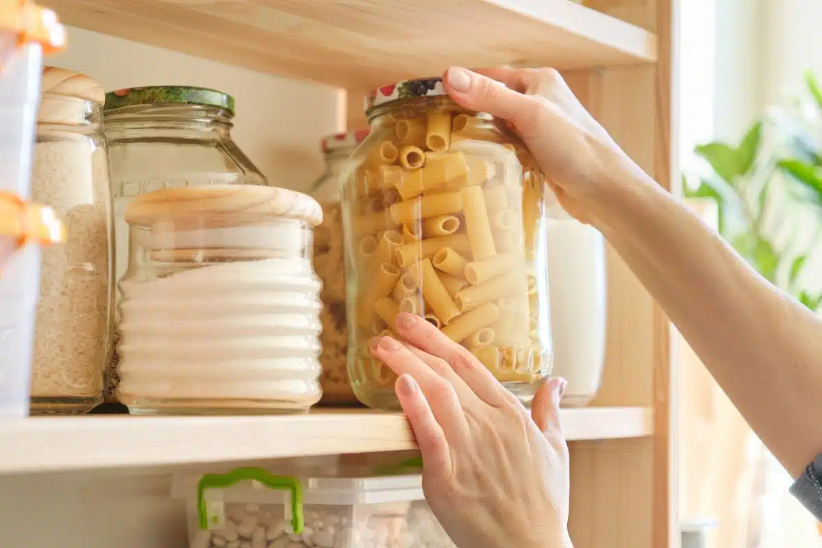 Skip the bulky packaging and pour flour, rice, oats, or beans into clear, stackable containers. It keeps food fresher and frees up precious shelf space.