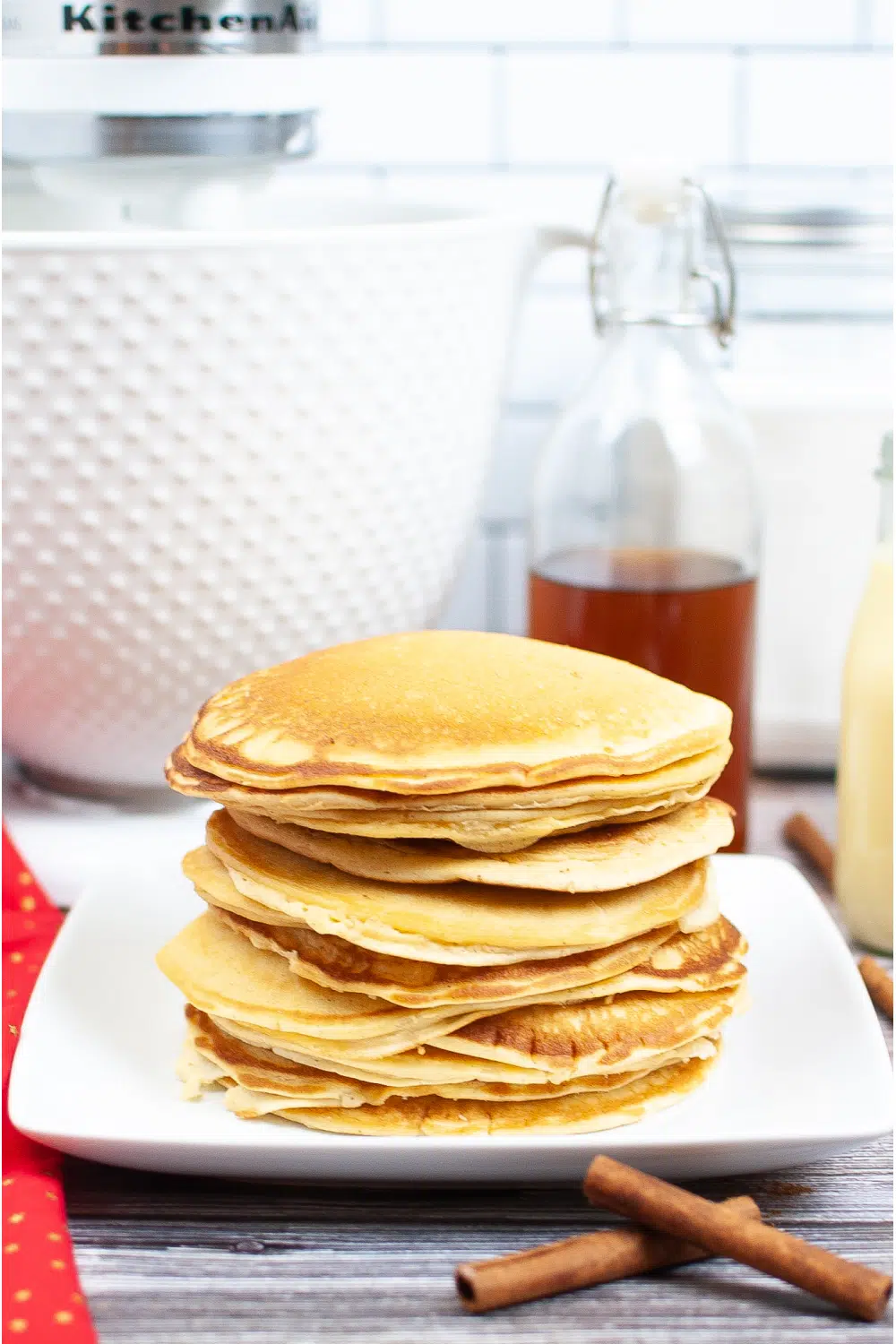 These Eggnog Pancakes can be made on a stovetop or on a griddle. Personally, I prefer to make my pancakes on the griddle. I am all about time-saving hacks.