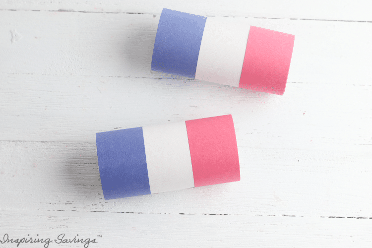 Next, wrap your blank toilet paper tubes with your freshly cut construction paper. Alternating them — Red, White, and Blue.