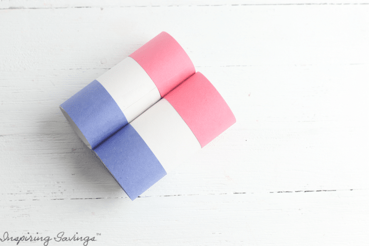Let’s first start by cutting strips of red, white, and blue construction paper. Each Strip should cover 1/3 of your tube or roughly 1 in wide.