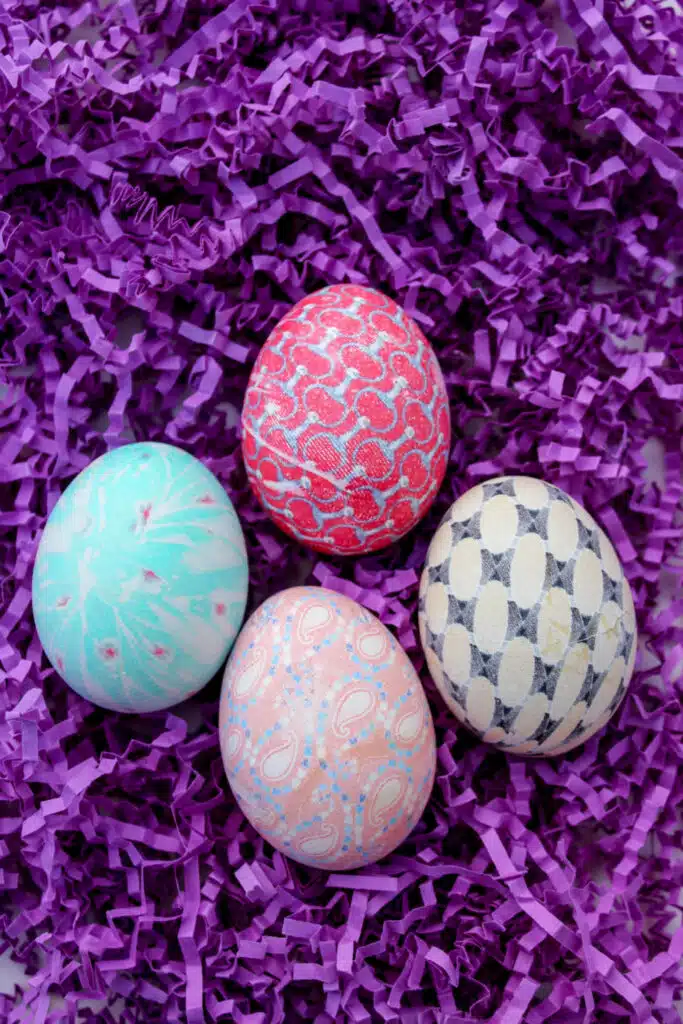 Silk tie-dyed Easter eggs are so much fun to make and way less messy than buying a dying kit or using vinegar and food coloring! Make beautiful-looking dyed Easter Eggs with this easy DIY Silk Tie Easter Eggs Tutorial.