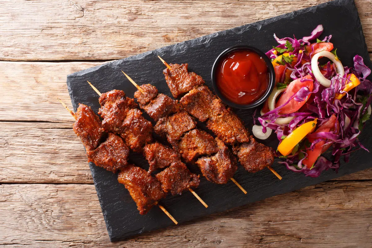 How to make at home: Marinate beef or chicken in a mix of ground peanuts, chili powder, ginger, and garlic. Grill and serve with sliced onions and tomatoes.