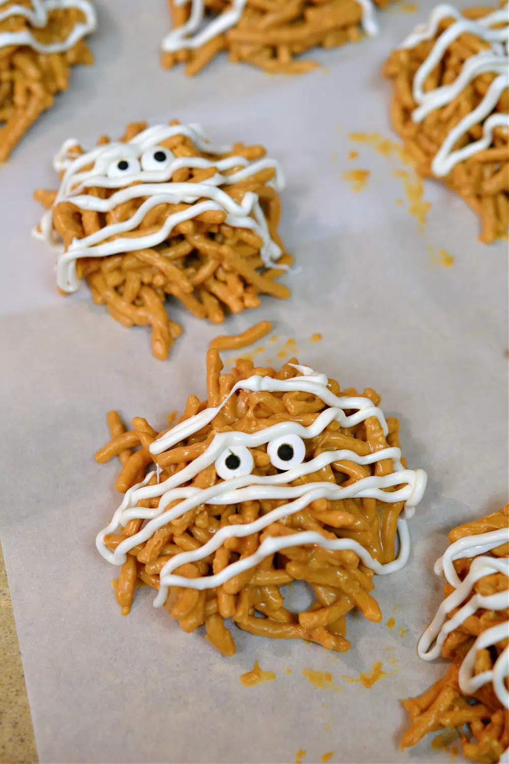 Have no Fear. These No-Bake Mummy Haystack Cookies are made with Chinese noodles, butterscotch, white chocolate, and optional peanut butter. Perfect Halloween treat.