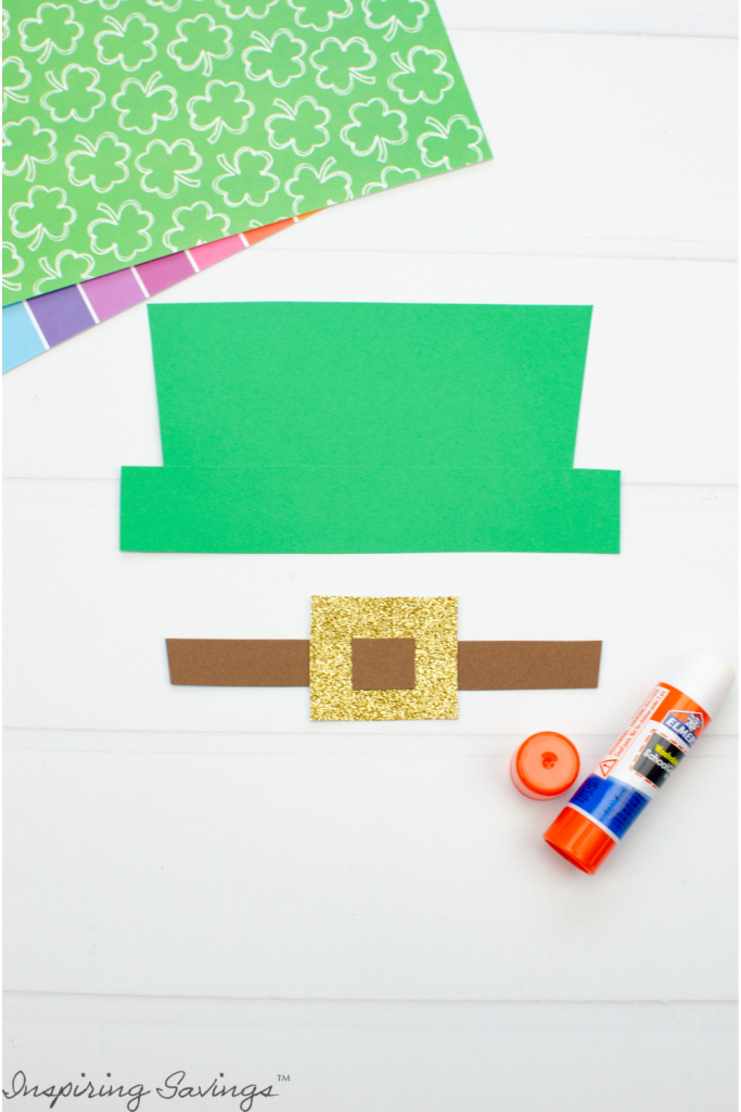 - Make the hat’s belt by gluing the small brown square to the gold square, then glue that to the long brown strip.