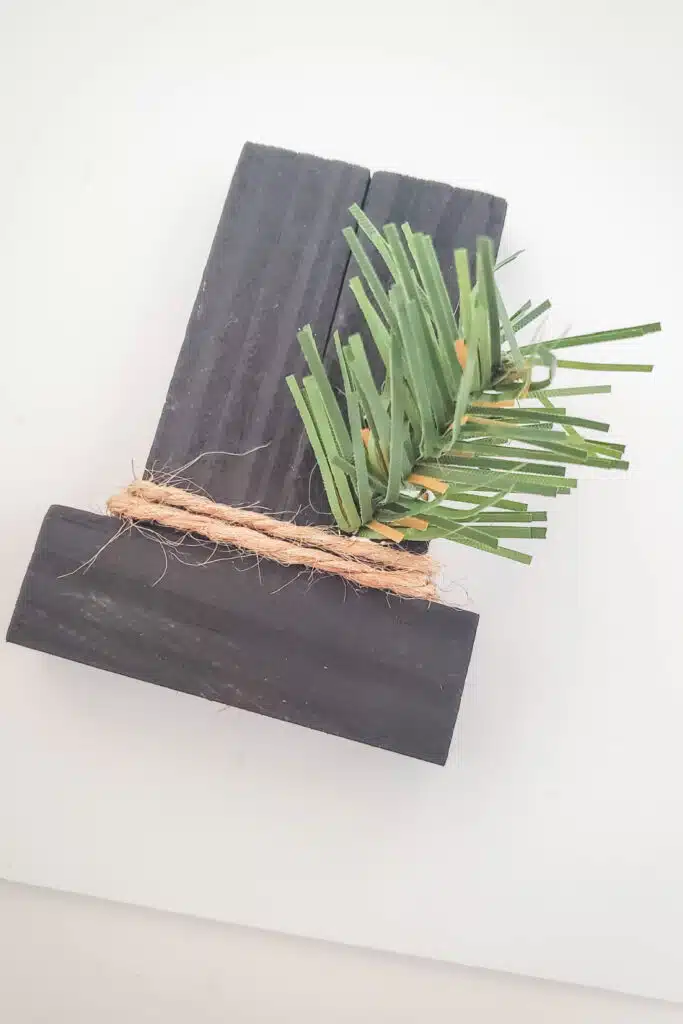 After your glue is ready, press your piece of garland and hold until secure for about 30 seconds. Depending on your glue, it may take a little longer.