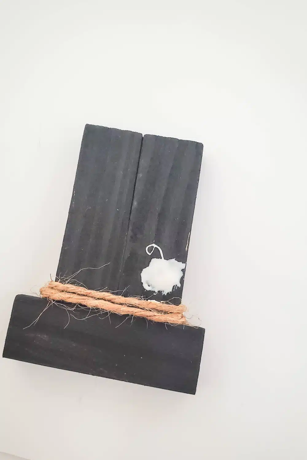 Using the toothpick, add a small amount of tacky glue to one side of the “hat”, where the 3 blocks meet. Set one end of the twine on top of the glue, at the very edge where all 3 blocks meet. Wrap the twine around twice, until the other end meets the end you just glued. Hold in place until secure.